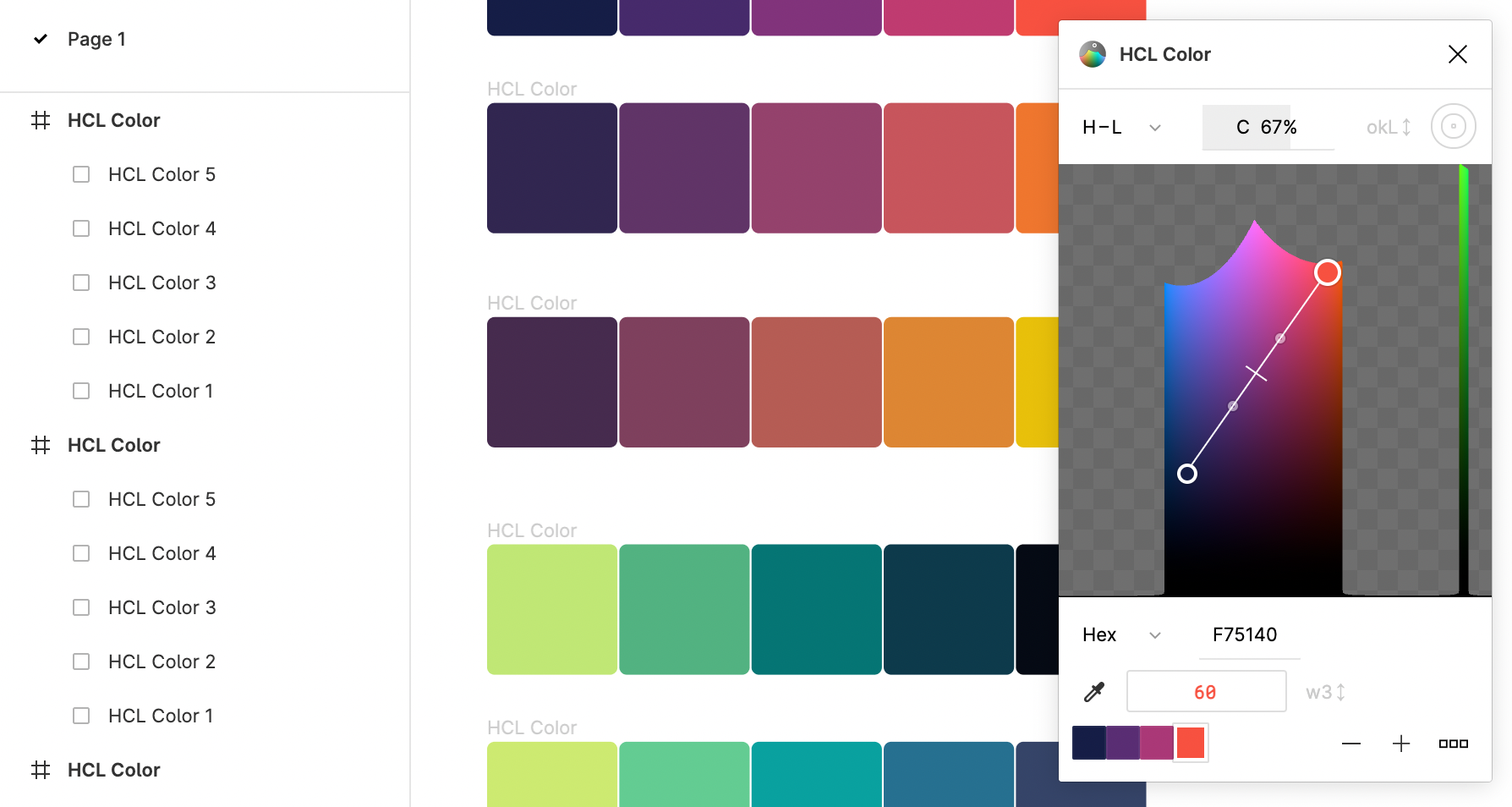 And I tried some color tools for Figma! That graphics editor lets users install plugins, and people built quite a few color plugins. Here’s e.g. the HCL Color plugin, that lets you create gradients in the Lab, LCH and OkLab space: